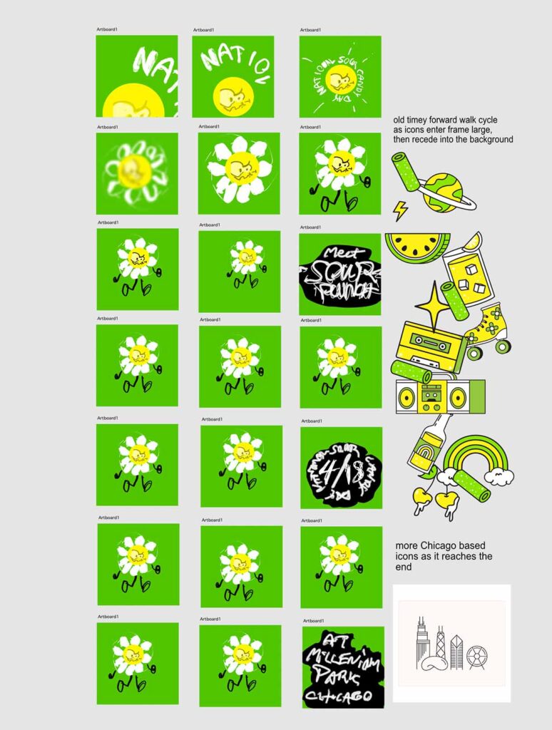 Play VideoPlay Video National Sour Candy Day Chicago Ad Responsibilities Storyboard Drawn walk cycle Comping Editing Project Facts: Millenium Park Chicago Sampling activation 2024 Storyboard Tags:AnimationCharaccterEvent
